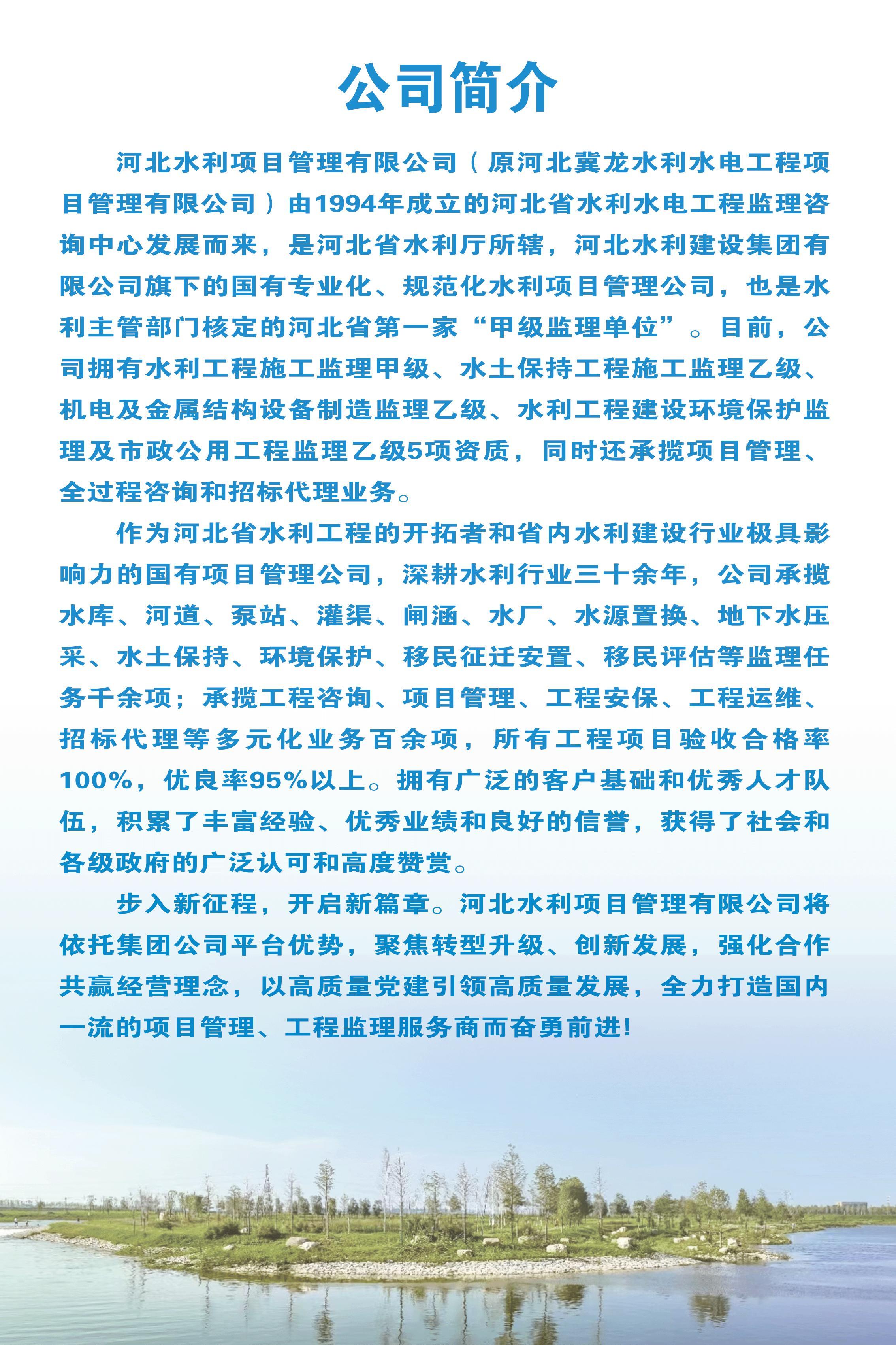 河北水利項目管理有限公司(原河北冀龍水利水電工程項目管理有限公司)由1994年成立的河北省水利水電工程監(jiān)理咨詢中心發(fā)展而來,是河北省水利廳所轄,河北水利建設集團有限公司旗下的國有專業(yè)化、規(guī)范化水利項目管理公司,也是水利主管部門核定的河北省第一家“甲級監(jiān)理單位”。